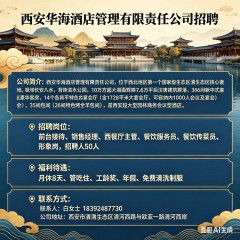 西安华海酒店管理有限责任公司招聘:前台接待、销售经理、西餐厅主管、餐饮服务员、餐饮传菜员、形象岗