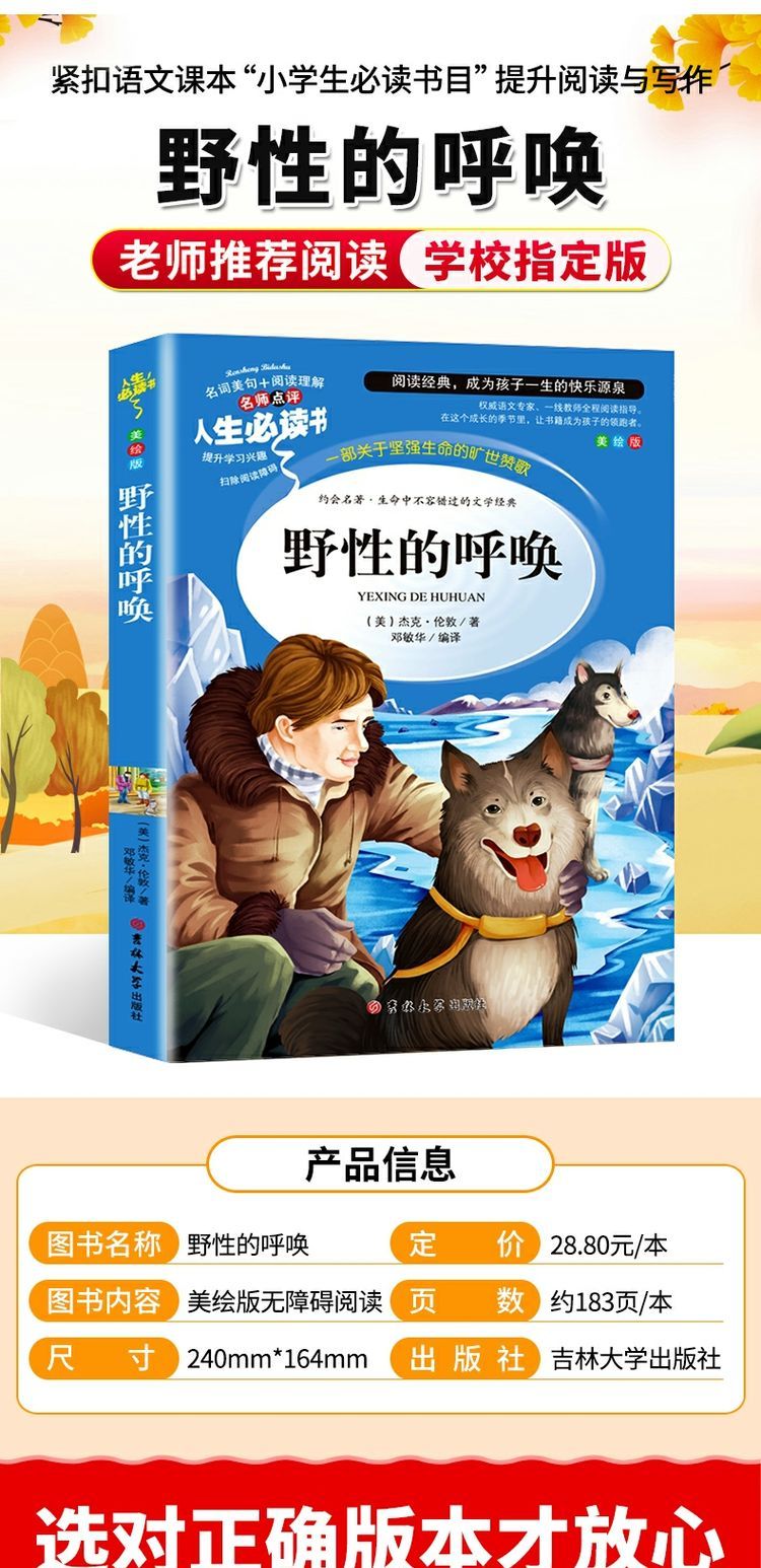 商品名称:人生必读书--野性的呼唤 小学生三年级四年级五六年级课外书籍 青少年无障碍阅读名著世界经典儿童文学奖 吉林大学出版社