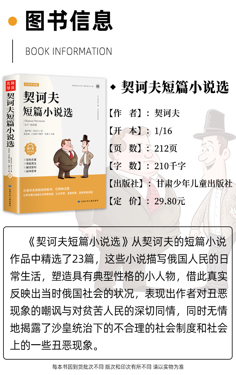 商品名称:契诃夫短篇小说选(双色)中小学生课外读物 青少年课外名著阅读 文学经典导读 课外书故事书 小学生课外阅读书籍 甘肃少年儿童出版社