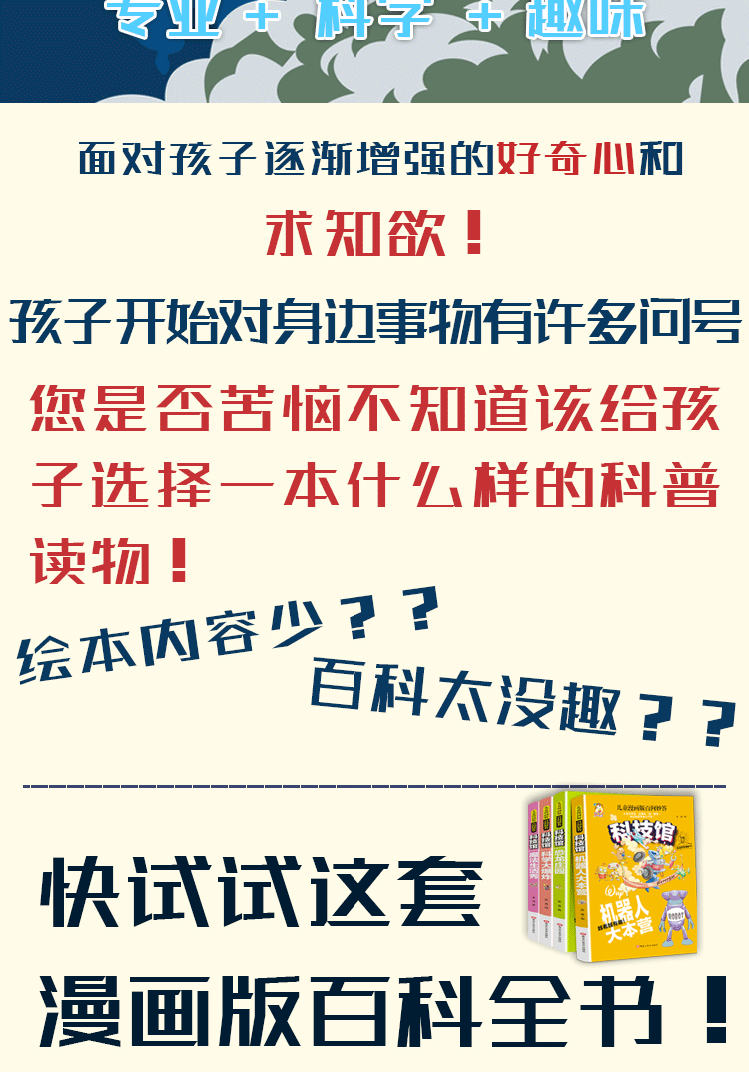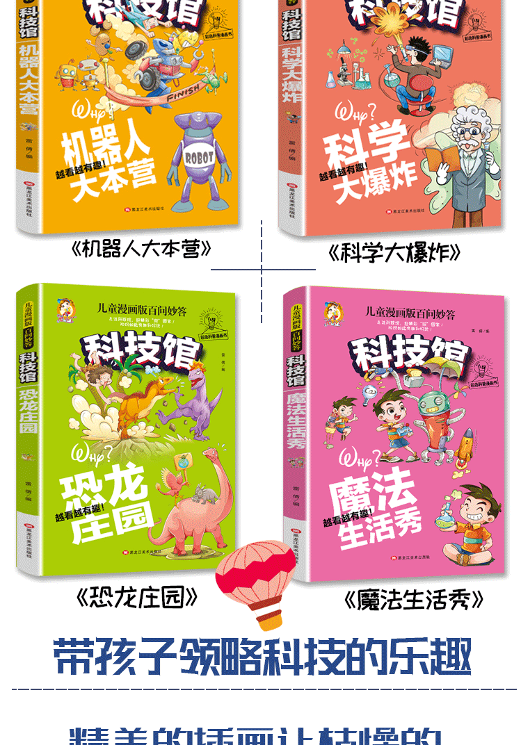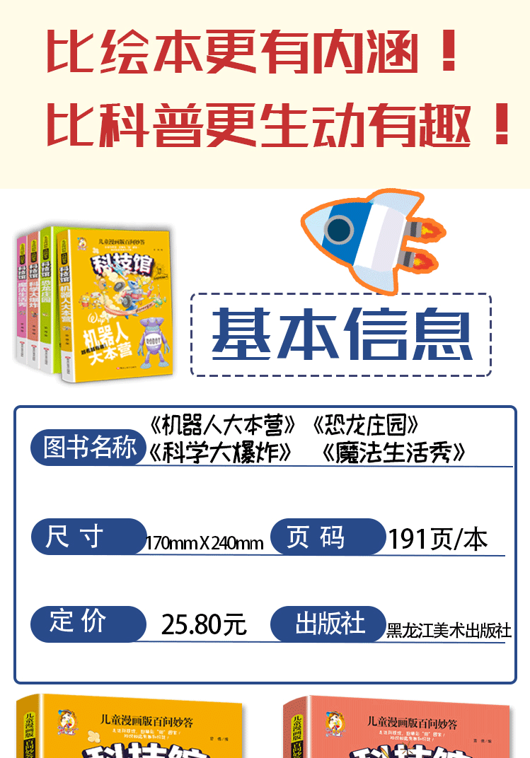 商品名称:科技馆全套4册 幼儿科普读物 机器人大本营(漫画版) 科学大爆炸(漫画版) 恐龙庄园(漫画版) 魔法生活秀(漫画版)儿童科普漫画书 幼儿科普百 黑龙江美术出版社