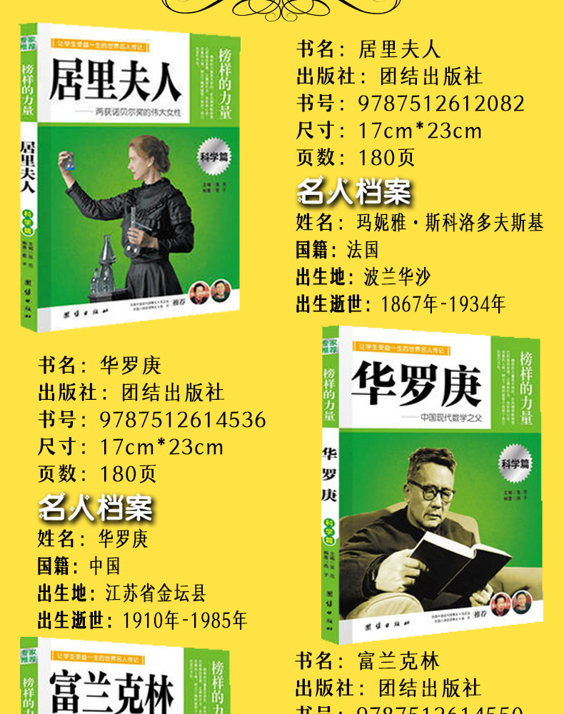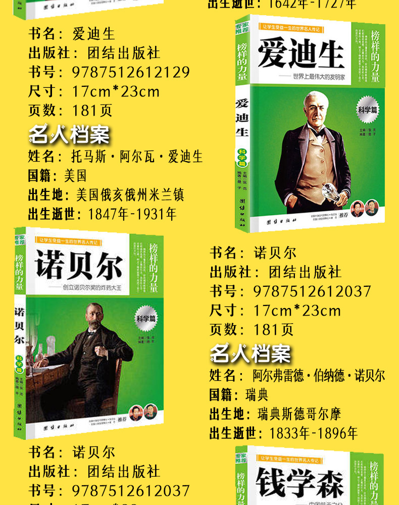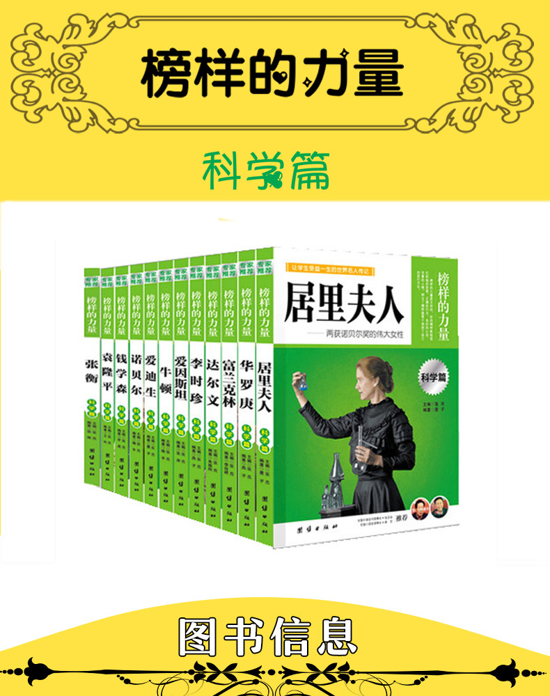商品名称:榜样的力量 科学篇全套12册 牛顿 爱迪生 诺贝尔 钱学森 袁隆平 张衡 居里夫人 爱因斯坦 李时珍 达尔文 富兰克林 华罗庚让学生受益一生的世界名人传记人物传记书籍 团结出版社