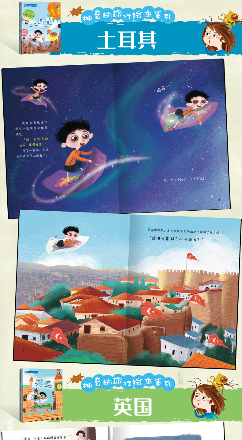 送银铃铛6收藏商品(5人气) 神奇的旅行绘本系列全6册/神奇的旅行.埃及 /神奇的旅行.冰岛 /神奇的旅行.法国/ 神奇的旅行.日本/ 神奇的旅行.土耳其/ 神奇的旅行.英国/黑龙江美术出版社/3-6-9岁幼儿童启蒙早教图画故事 亲子共读睡