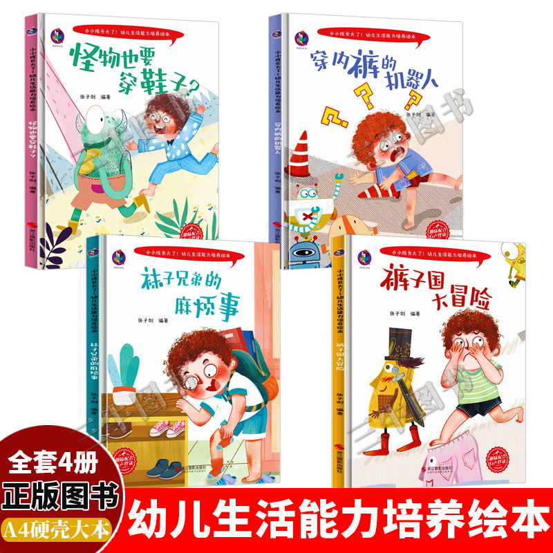商品名称:小小孩长大了!幼儿生活能力培养绘本系列4册/穿内裤的机器人 /怪物也要穿鞋子? /裤子国大冒险 /袜子兄弟的麻烦事/浙江摄影出版社/宝宝我会自己穿衣服儿童行为习惯养成绘本精装硬壳幼儿园故事书