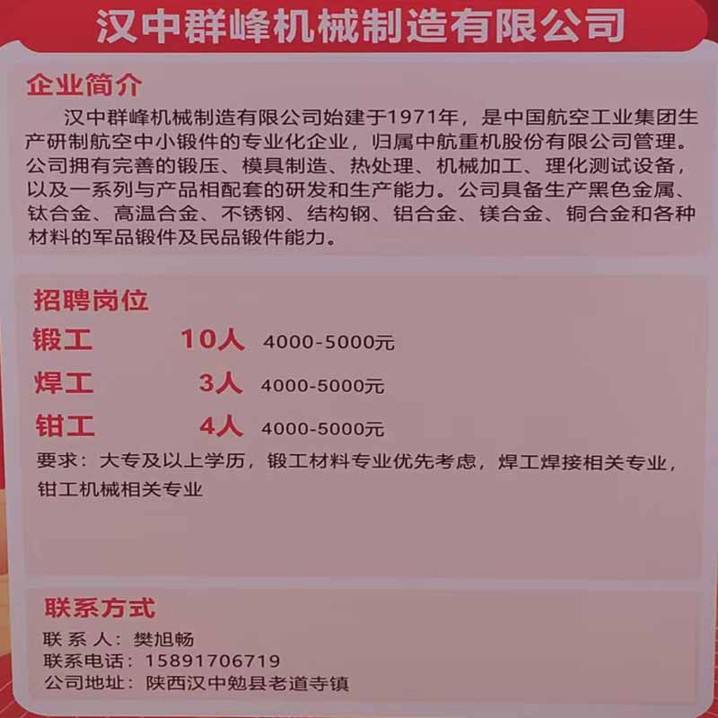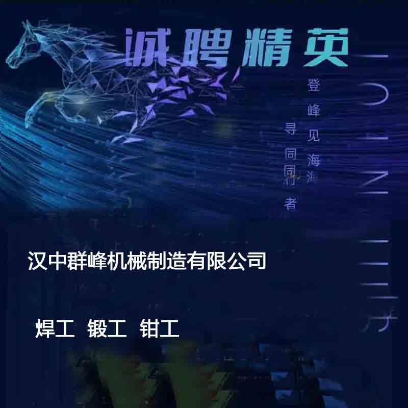 商品名称:公司招聘:焊工、锻工、钳工/汉中群峰机械制造有限公司/薪资:4000-5000月