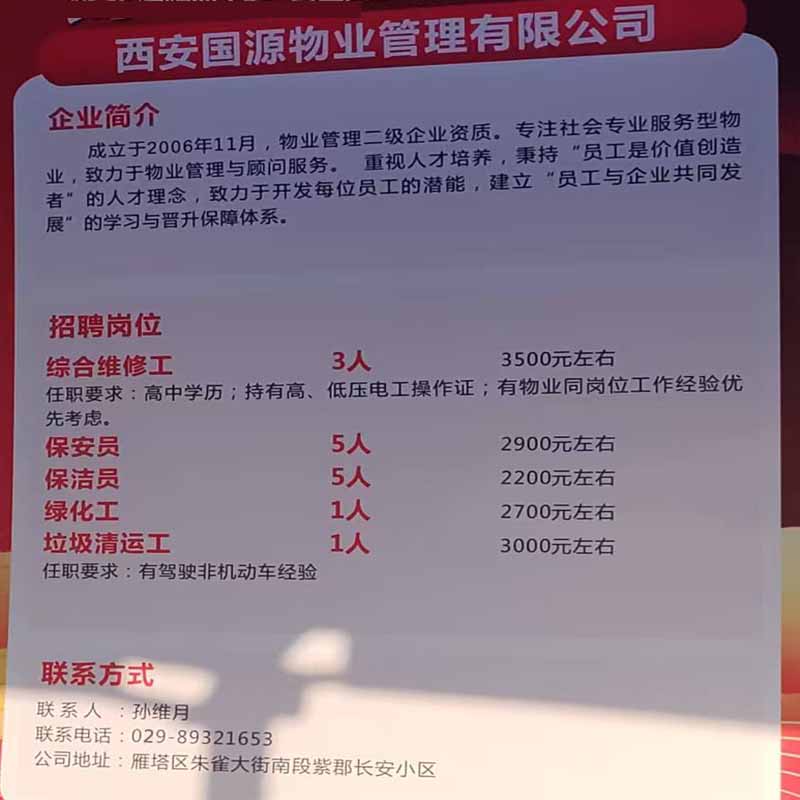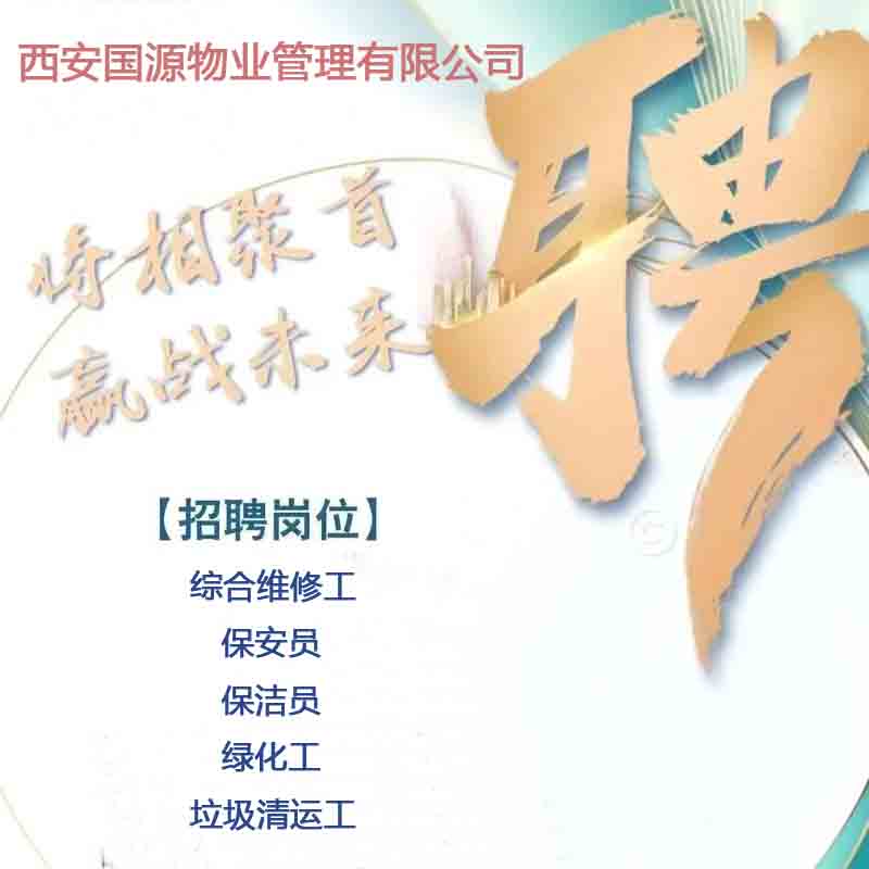 商品名称:公司招聘:综合维修工 3500元左右/月, 保安员 2900元左右/月, 保洁员 2200元左右/月, 绿化工 2700元左右/月, 垃圾清运工 3000元左右/月 /西安国源物业管理有限公司