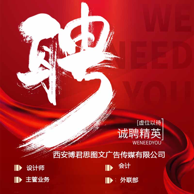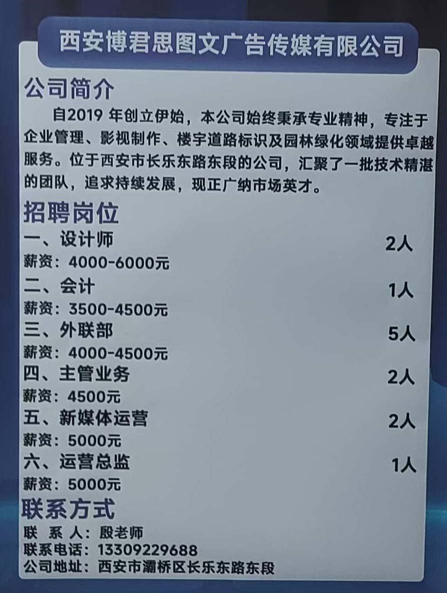 商品名称:西安博君思图文广告传媒有限公司招聘:设计师, 会计,主管业务 ,外联部/薪资:4000-6000元/月