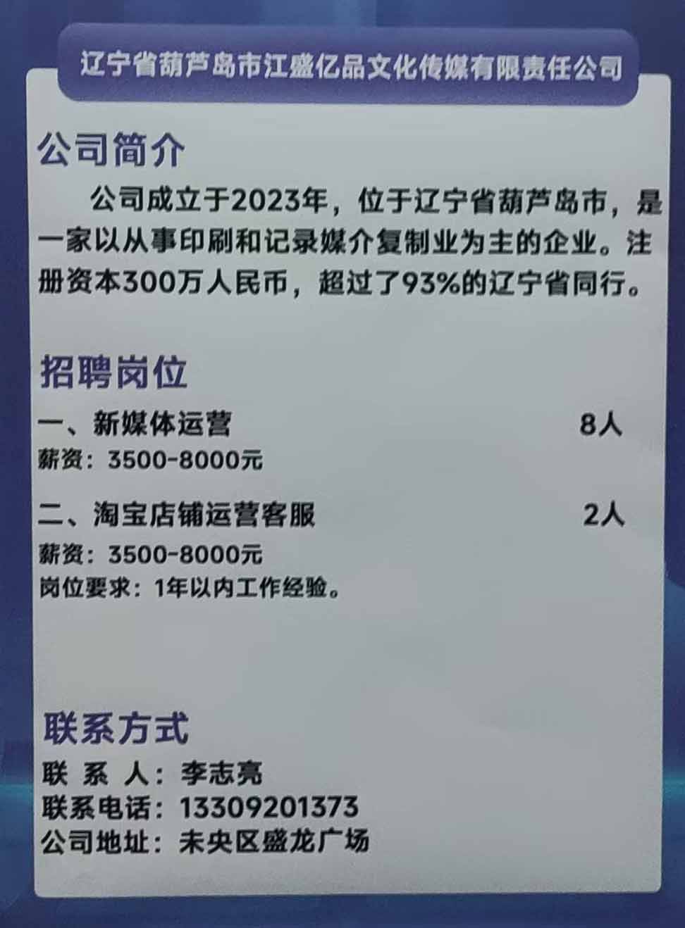 商品名称:辽宁省葫芦岛市江盛亿品文化传媒有限责任公司招聘:新媒体运营 淘宝店铺运营客服/薪资:3500-8000