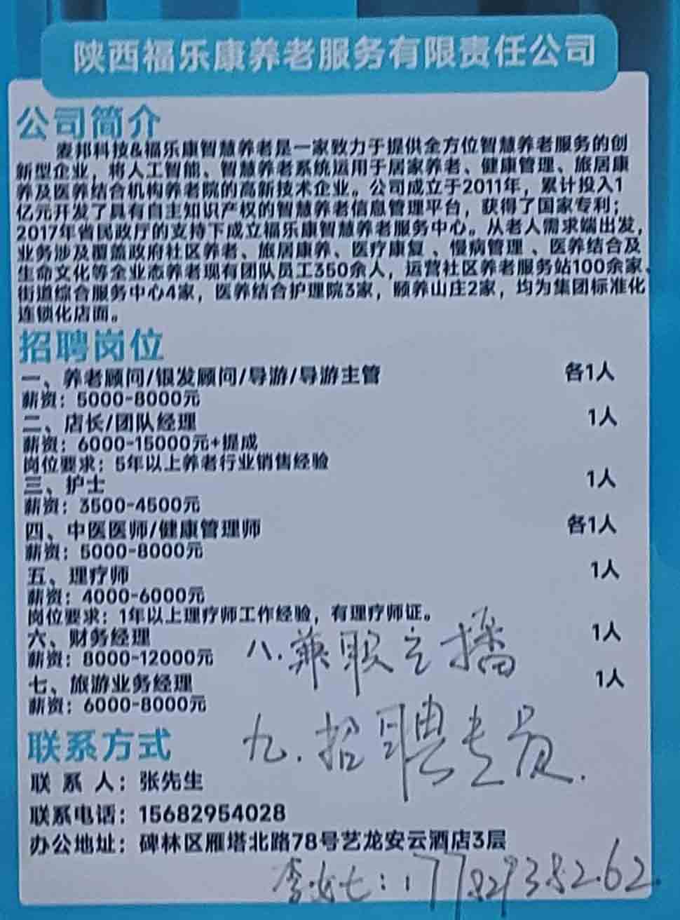 商品名称:陕西福乐康养老服务有限责任公司招聘:养老顾问 银发顾问 导游 导游主管 店长 团队经理 护士 中国医师 健康管理师 理疗师 财务经理 旅游业务经理 招聘专员
