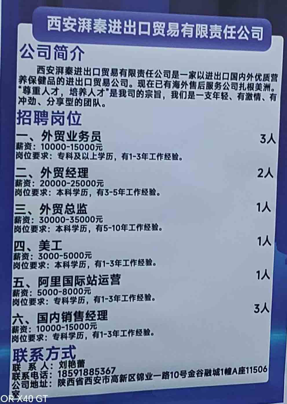 商品名称:西安湃秦进出口贸易有限责任公司招聘:外贸业务员 外贸经理 外贸总监 美工 阿里国际站运营 国内销售经理