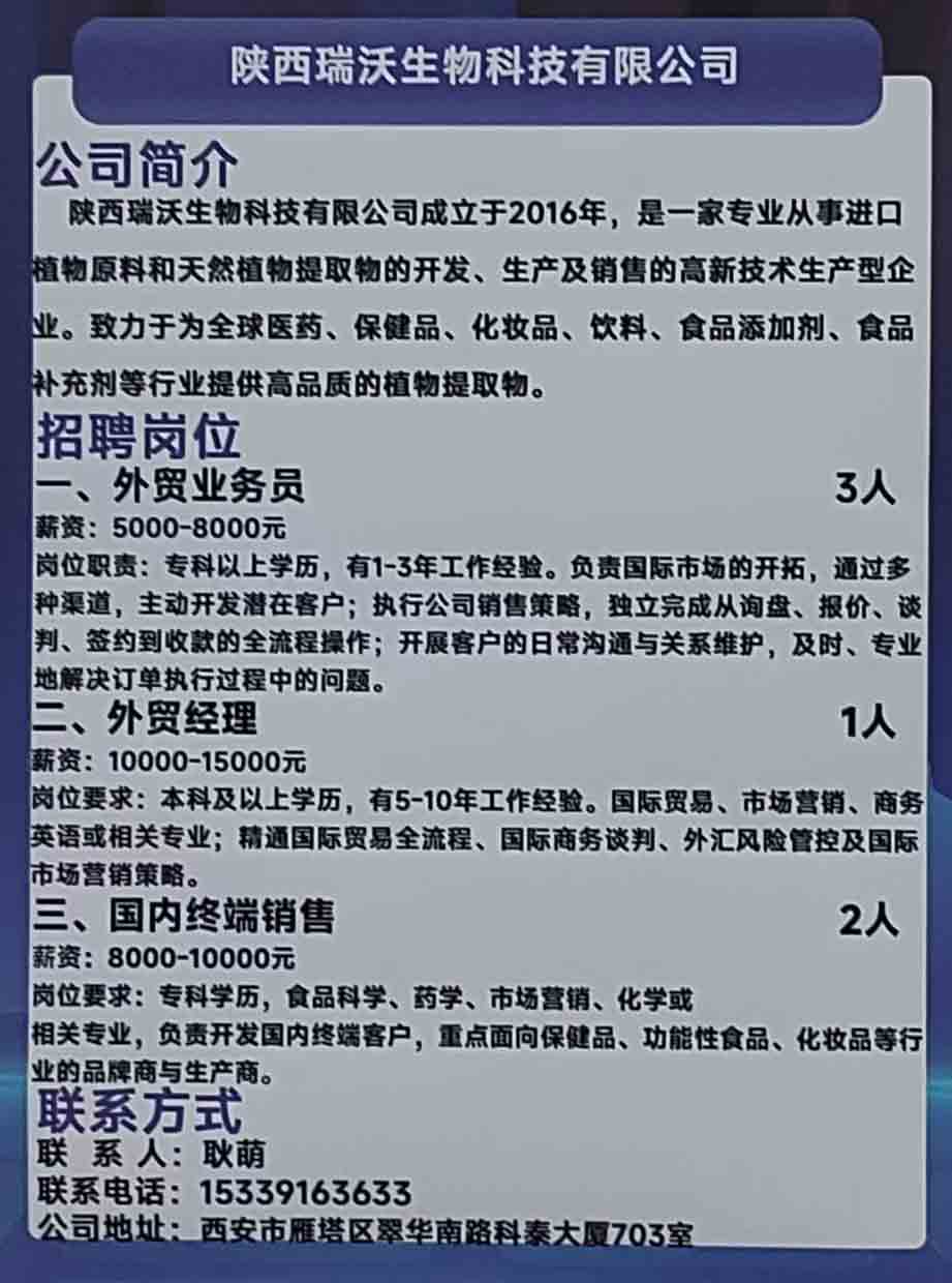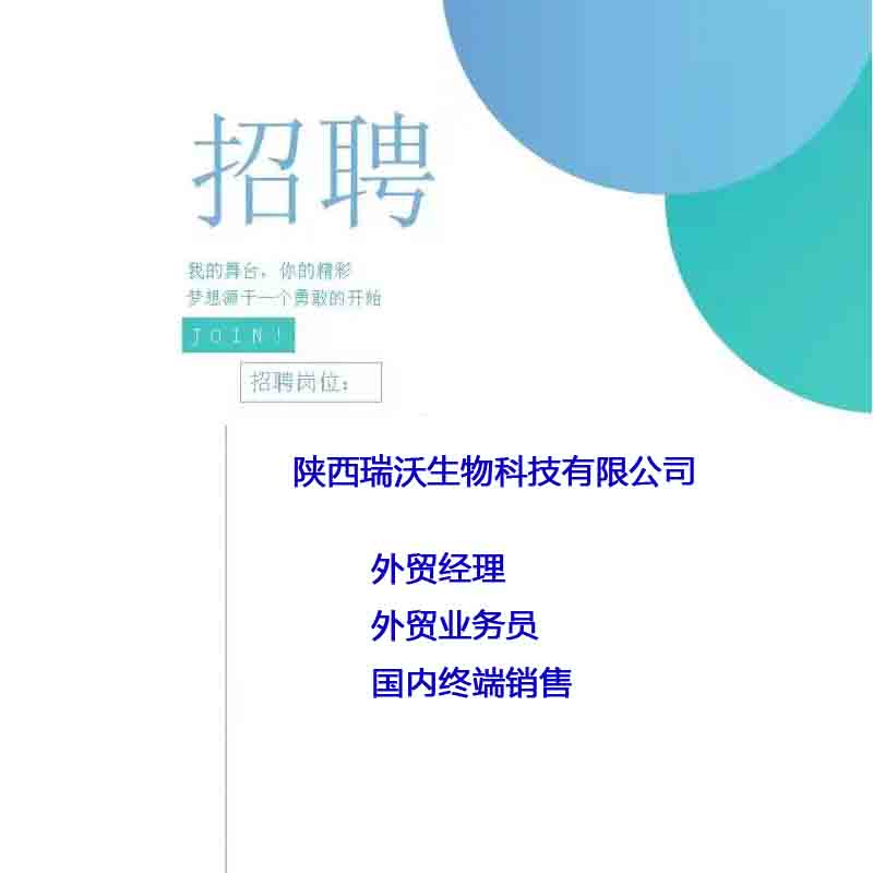 商品名称:陕西瑞沃生物科技有限公司招聘:外贸业务员, 外贸经理, 国内终端销售