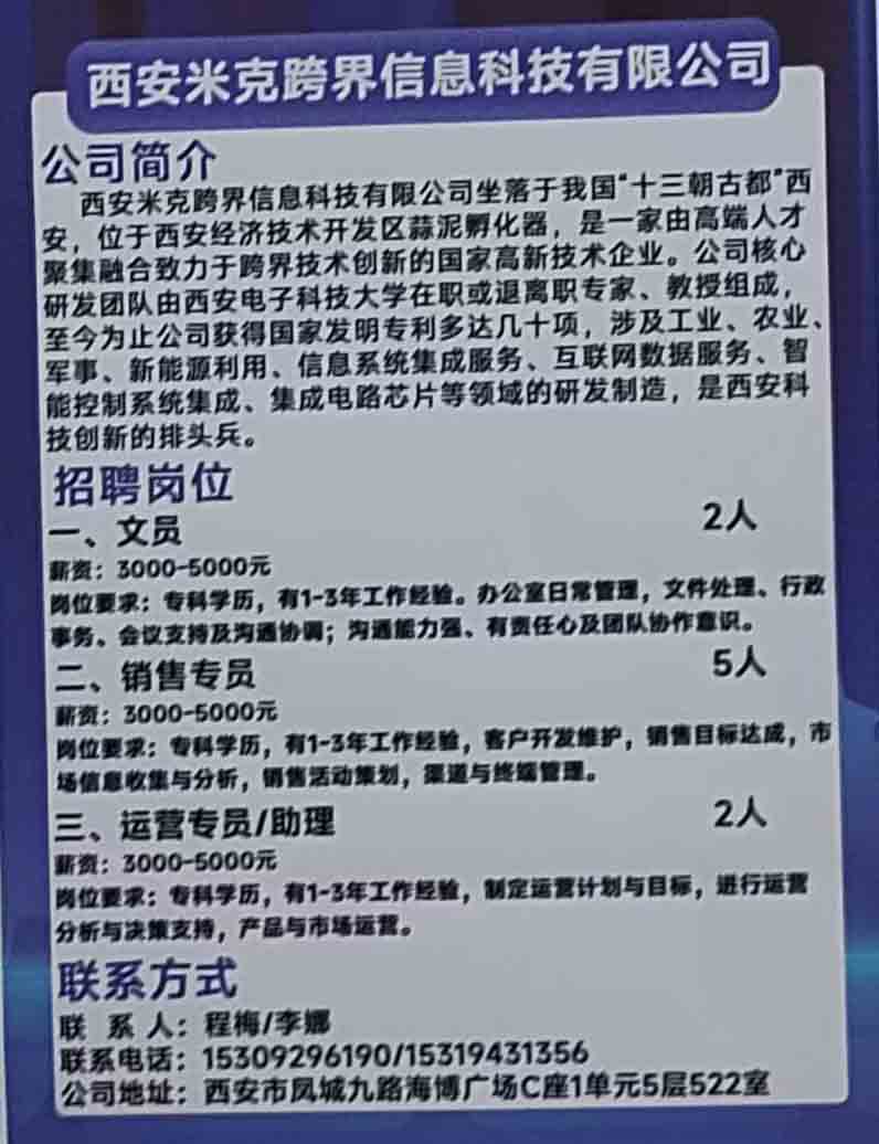 商品名称:西安米克跨界信息科技有限公司招聘:文员, 销售专员, 运营专员/助理