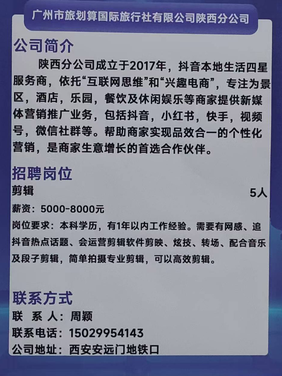 商品名称:广州市旅划算国际旅行社有限公司陕西分公司招聘:剪辑