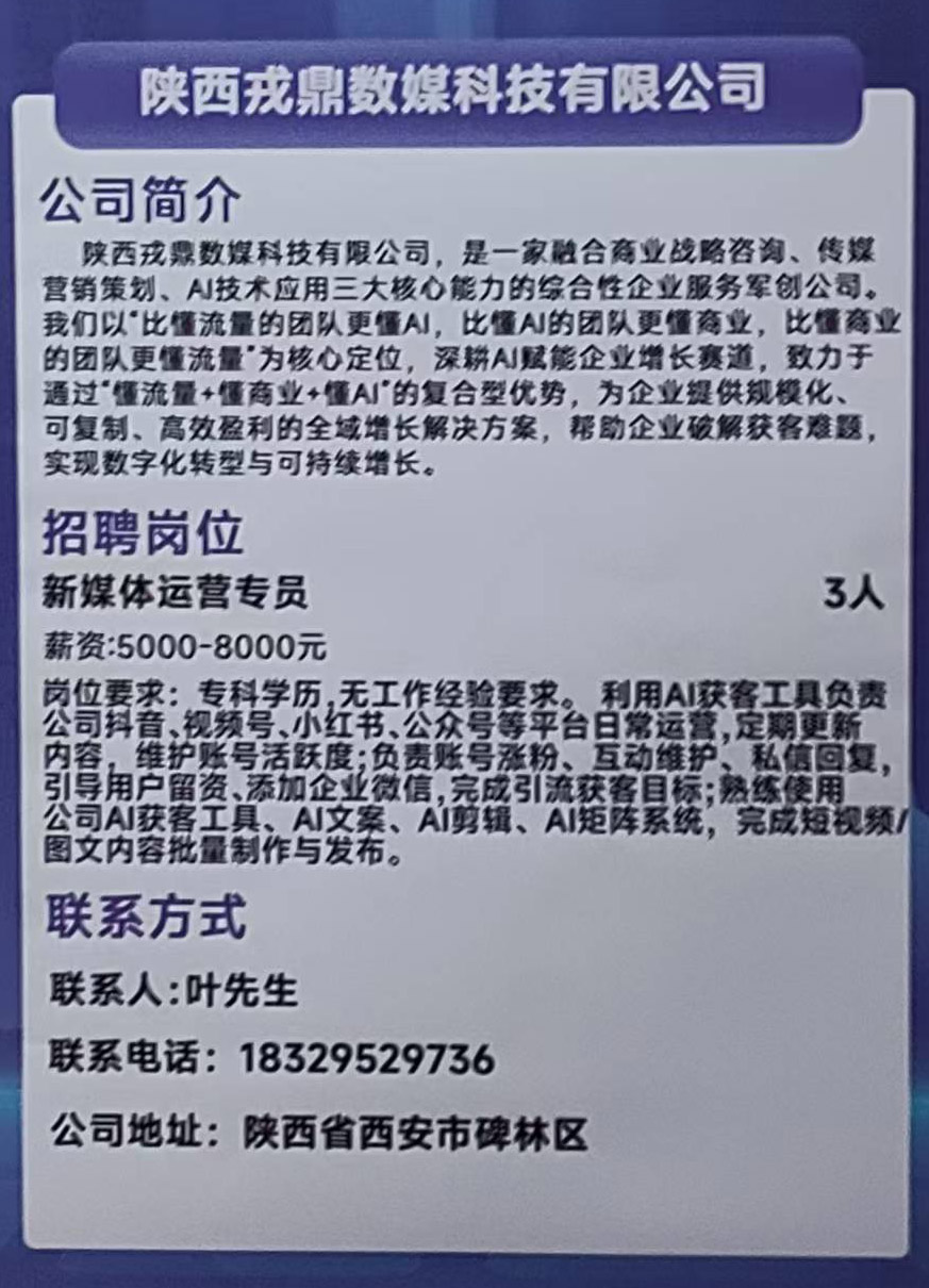 商品名称:陕西戎鼎数媒科技有限公司招聘:新媒体运营专员
