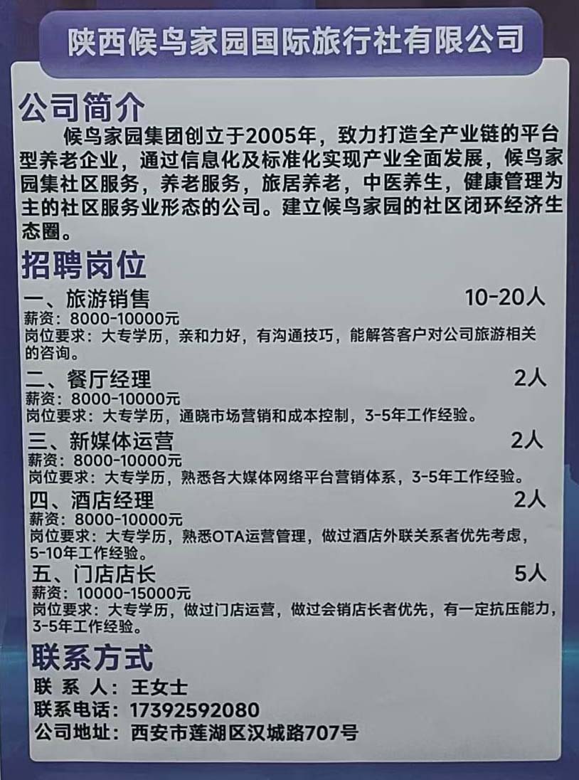 商品名称:陕西候鸟家园国际旅行社有限公司招聘:旅游销售 餐厅经理 新媒体运营 酒店经理 门店店长