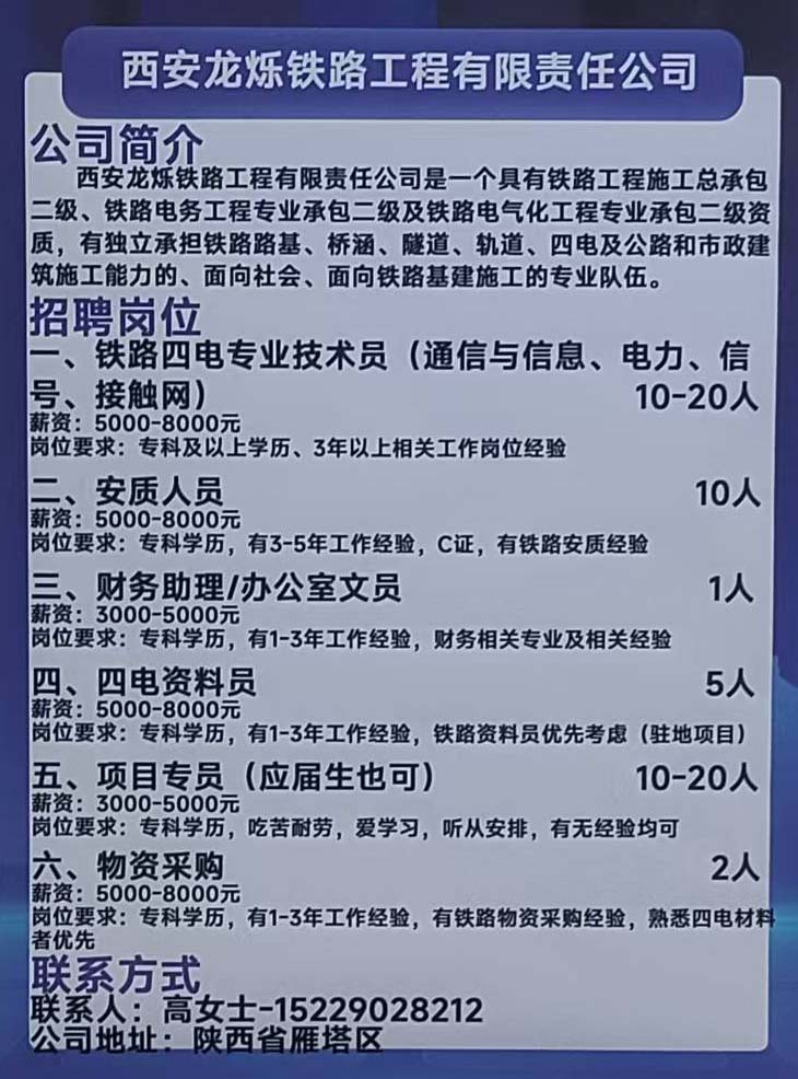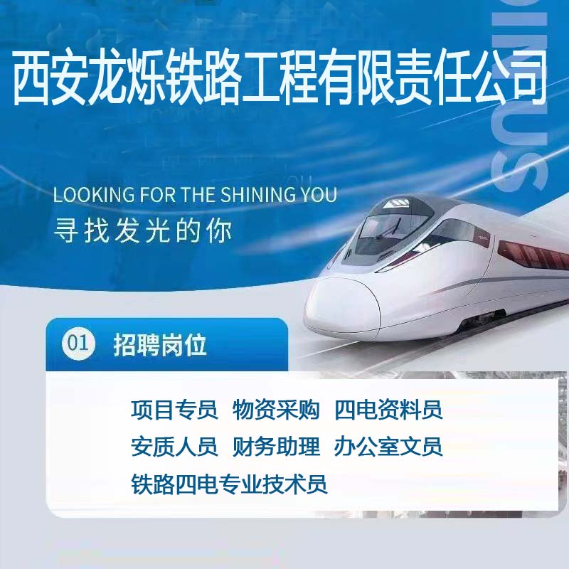 商品名称:西安龙烁铁路工程有限责任公司招聘:项目专员, 物资采购,铁路四电专业技术员, 安质人员, 财务助理, 办公室文员, 四电资料员