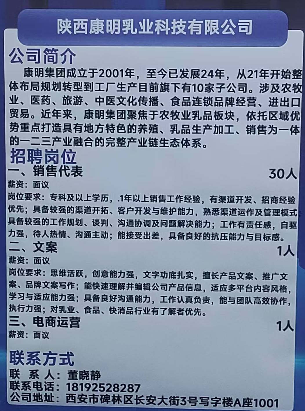 商品名称:陕西康明乳业科技有限公司招聘:销售代表 文案 电商运营