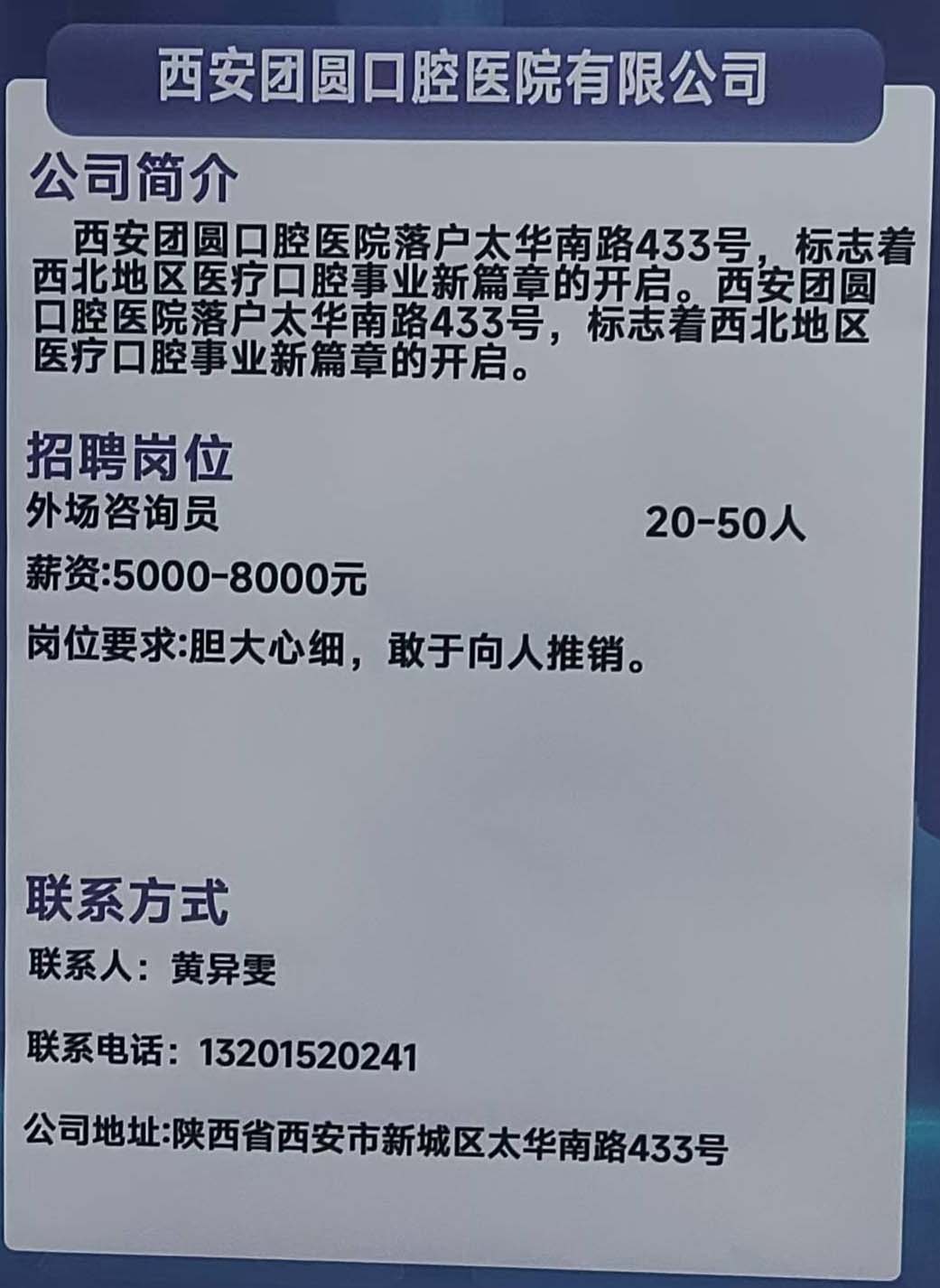 商品名称:西安团圆口腔医院有限公司招聘:外场咨询员