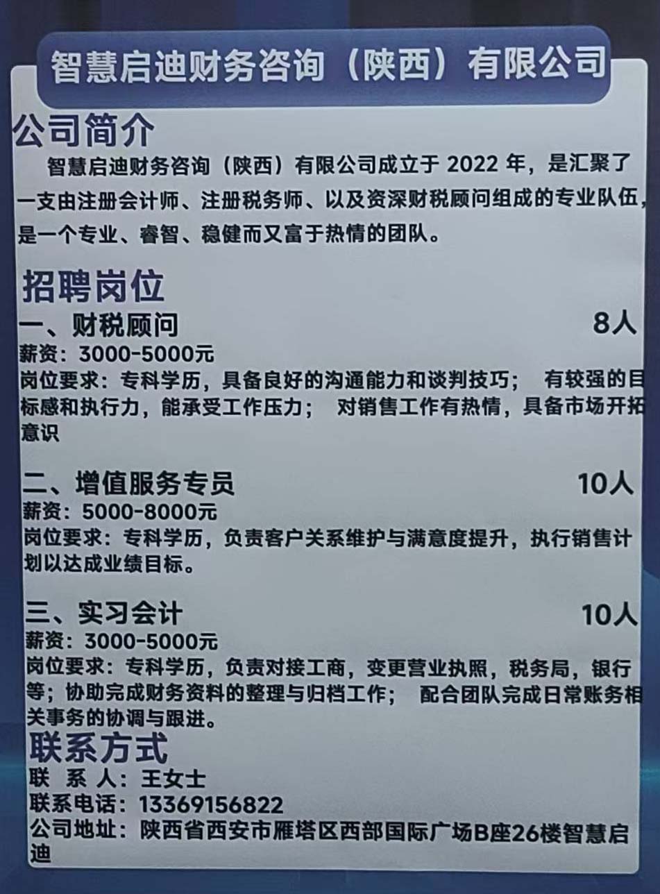 商品名称:智慧启迪财务咨询(陕西)有限公司招聘:财税顾问 增值服务专员 实习会计