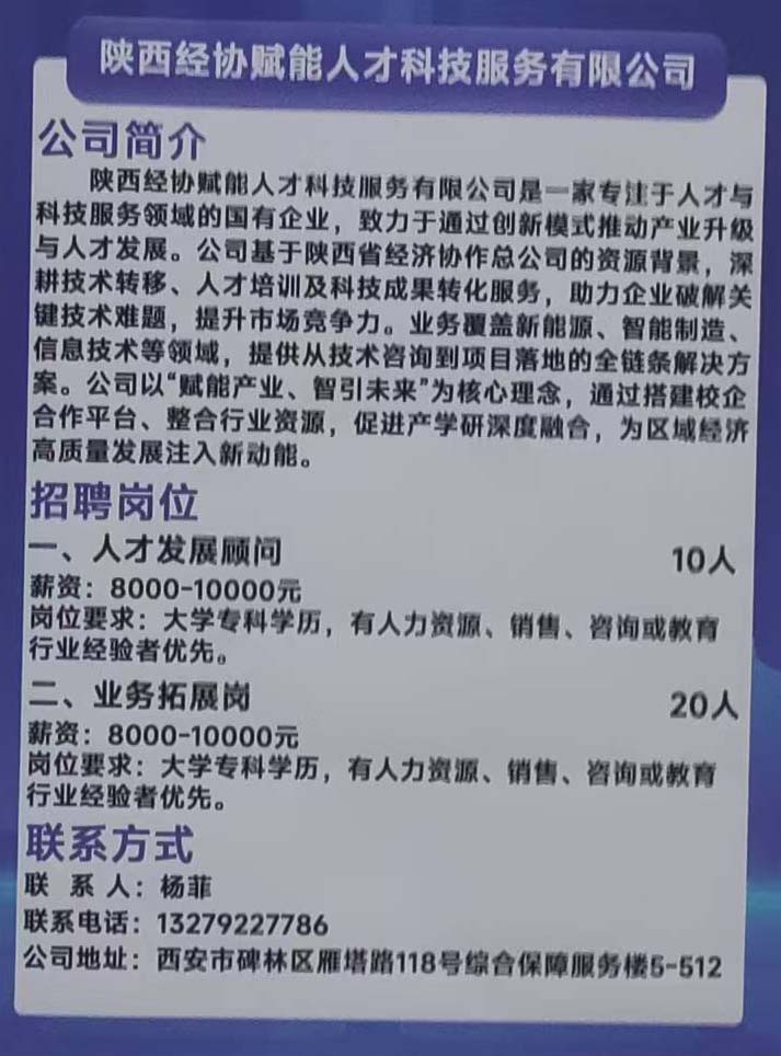 商品名称:陕西经协赋能人才科技服务有限公司招聘:人才发展顾问, 业务拓展岗
